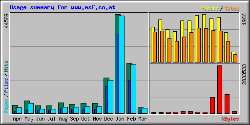 | Day | Hits | Files | Pages | Visits | Sites | KBytes | ||||||